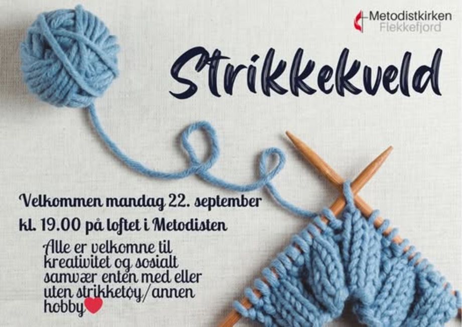 Mandag 22. september starter et nytt tilbud i Metodisten. Vi inviterer alle som er interesserte i kreativt og/eller sosialt samvær til strikkekveld en mandag i måneden. Det spiller ingen rolle om du er erfaren med håndarbeid eller ikke, for her får du mulighet til å lære av andre som er flinke. Har du mest lyst til å ha noen å prate med, er du også velkommen uten noe å jobbe med.