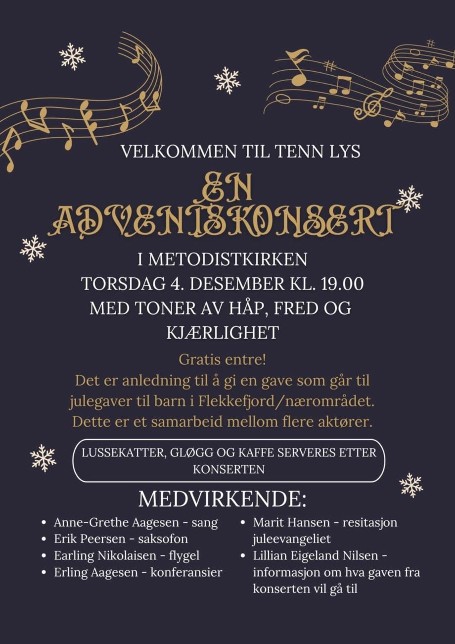 Torsdag 4. desember er du hjertelig velkommen til en flott adventskonsert i Metodistkirken.