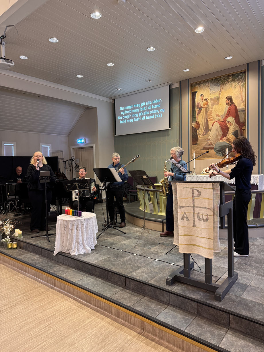 Denne gudstjenesten sto de for pre- og postludium, salmesang og musikk under bønnevandringen - til stor begeistring for oss som satt i salen og lyttet. Husbandet er satt sammen av Anne med støtte fra Earling Nikolaisen, og forhåpentligvis er dette starten for et band som vil gi oss mye glede fremover.